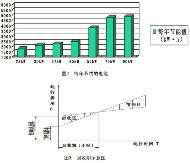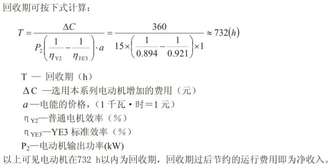 通过表1对比发现 YE3 160L-4 15kW电动机,铜重比 Y2 160L-4 15kW高出43%,硅钢片重比YE3 160L-415kW高出22%,铝重比Y2 160L-4 15kW高出15.6%。按当前材料价格(漆包线5.5万元/吨,铝1.68万元/吨,50W470硅钢板0.68万元/吨),有效材料费用增加360元。与Y2系列电动机相比,采用YE3电动机所增加的费用可从节约的电费中回收,在回收期以后节约的运行费用为净收入,每年节约的电能(见图2),回收期(见图3)。