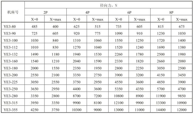 最大径向力:径向负载的最大允许径向力F 0 (单位:N)是基于以下前提条件而言的,即负载力的作用线(即皮带轮的中心)必须在自由轴伸的长度以内(长度为X),长度X(mm)是从轴肩到F力作用线之间的距离。因此,长度X max就是轴伸的总长度,50Hz情况下的最大径向力,基本结构型式(见表14)。