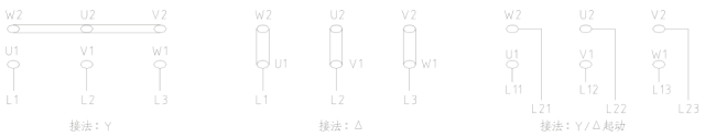 3kW 及以下电机为 Y 接法,3kW 以上电机为Δ接法,接线指示图(见图 4)。