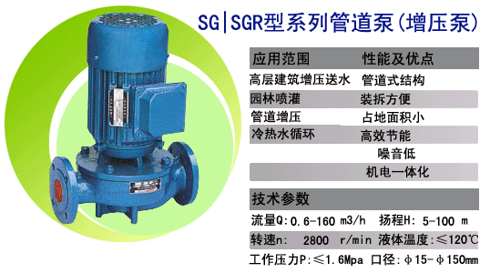 SG型管道泵是为增压输送,解决管道压力过低而研制的新颖泵,比目前应用卧式离心泵具有很大的优越性。由于采用先进机械密封,电机主轴直接安装叶轮,故有效率高,耗电省,结构紧凑,体积小,重量轻,装修方便等特点,并可根据扬程与流量需要并串联使用。